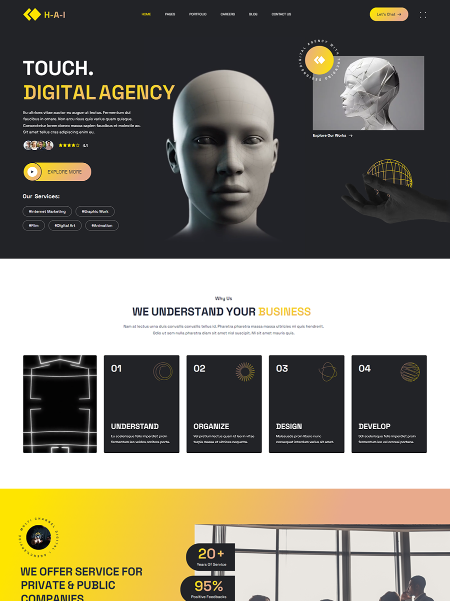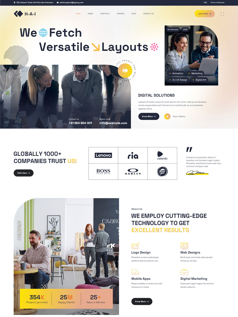 Hai is an excellent solution for startups, co-working space, cloud hosting, application, event, business, personal portfolio, services, enterprises, social media marketing, Digital agency, Tax Consultant, Law Firms, Consulting Business websites, Design Studios